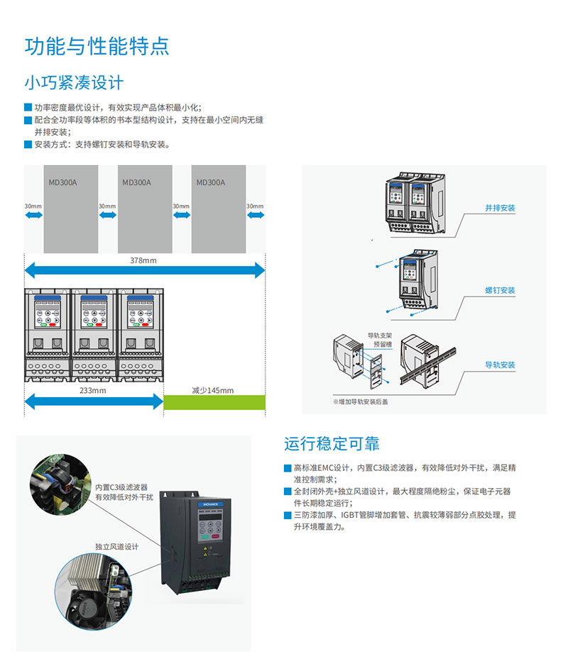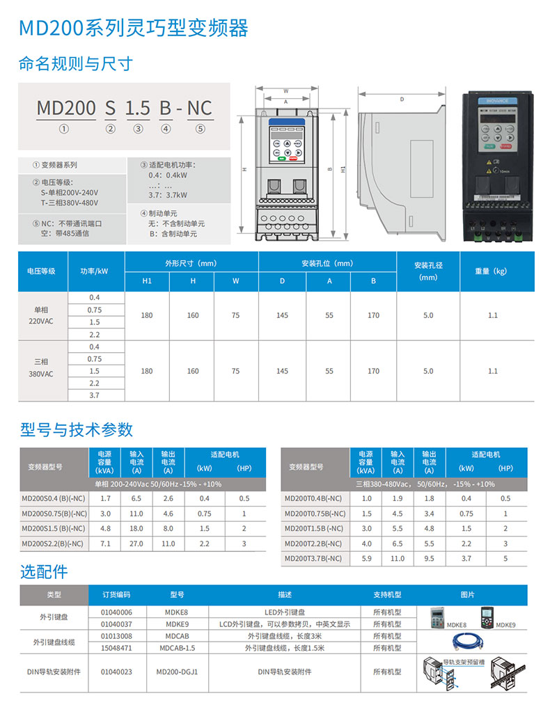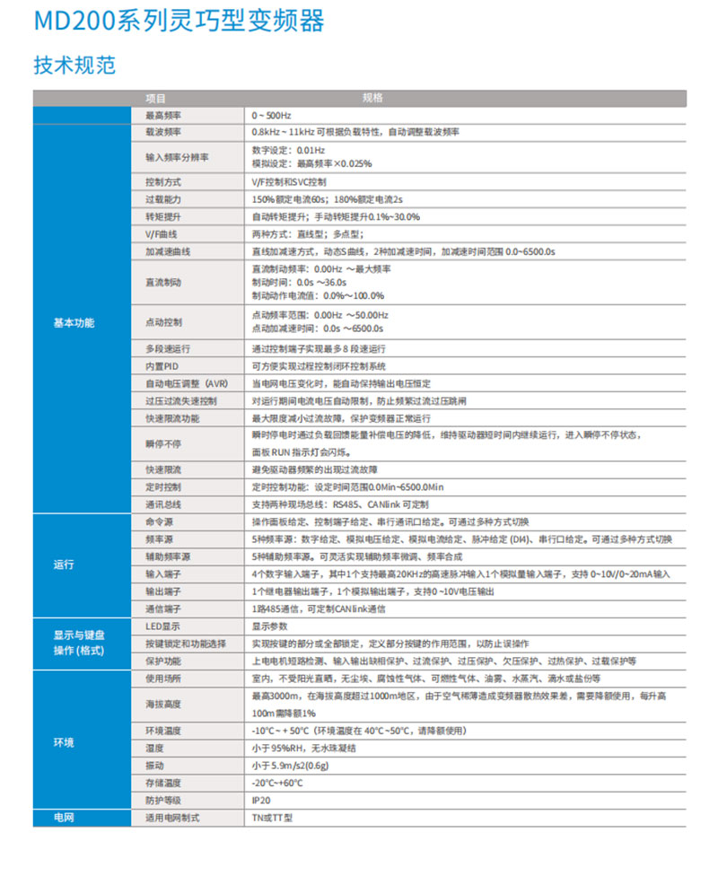 MD200 系列紧凑型变频器是汇川技术基于小功率、小体积、低成本的市场需求,针对性推出的单相220 VAC 和三相380 VAC 迷你变频器。MD200 采用V/F 控制方式、无速度传感器矢量控制方式(SVC),具有高功率密度、高EMC 规格设计、高防护性能等显著优势。
